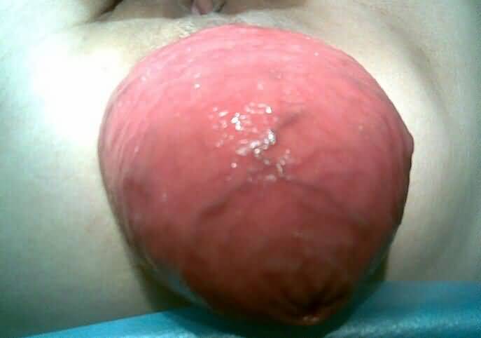 (2) Ⅱ度脱垂:为直肠全层脱出,脱出物长5~10cm,呈圆锥状,淡红色,触之较厚,有弹性,肛门松弛,便后有时需用手回复。
